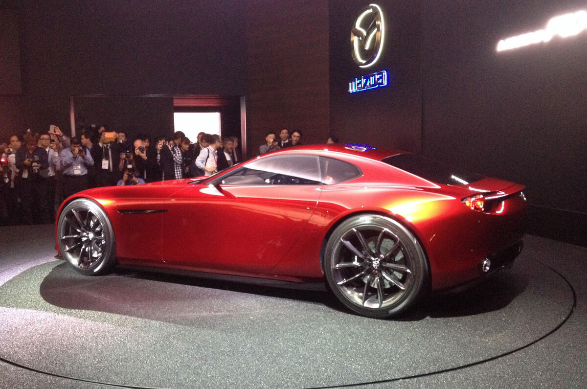 The RX-Vision measures 4389mm long by 1925mm wide, with a height of 1160mm and a wheelbase of 2700mm. Those dimensions make it marginally longer and wider than Jaguar’s F-Type coupé sports car, and significantly lower, something the compact nature of the rotary engine has allowed.