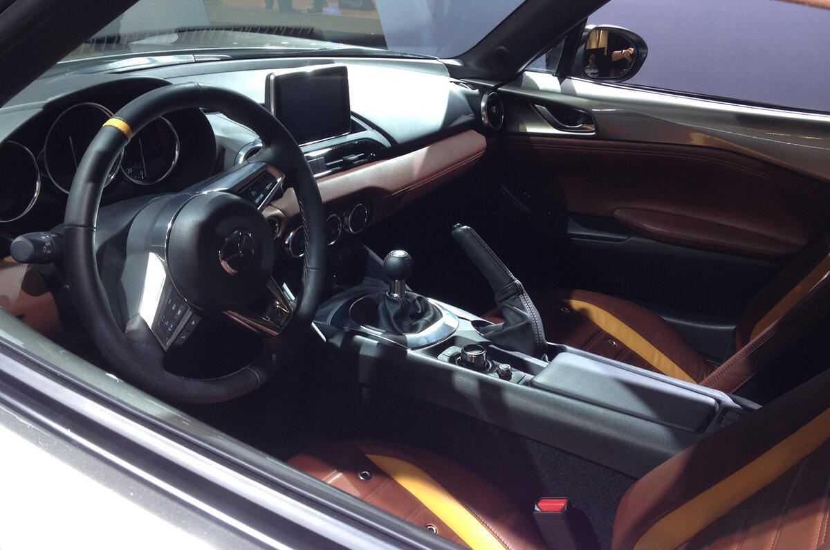 The MX-5 Spyder's cabin features handmade leather interior trim elements, while its silver paint, passenger seat cover and rear deck are bespoke. The concept sits on 17in alloy wheels and includes carbonfibre exterior trim.