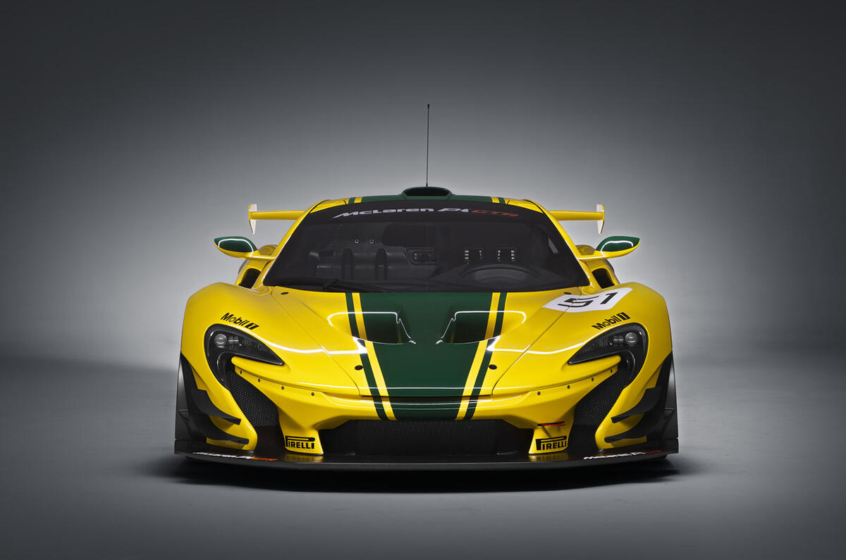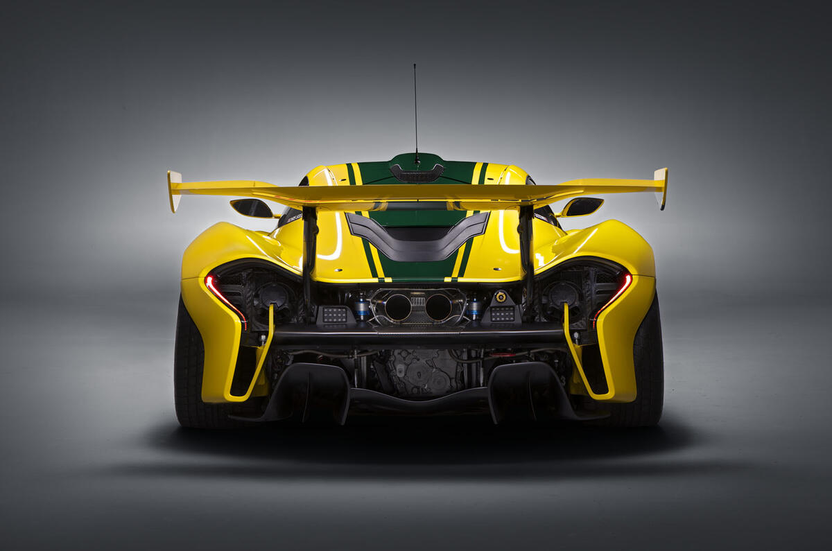 The front track of the P1 GTR is 80mm wider than the P1 road car's, and it sits 50mm lower to the ground on a fixed ride height. It runs on 19in centre-locking motorsport alloy wheels with slick Pirelli tyres.