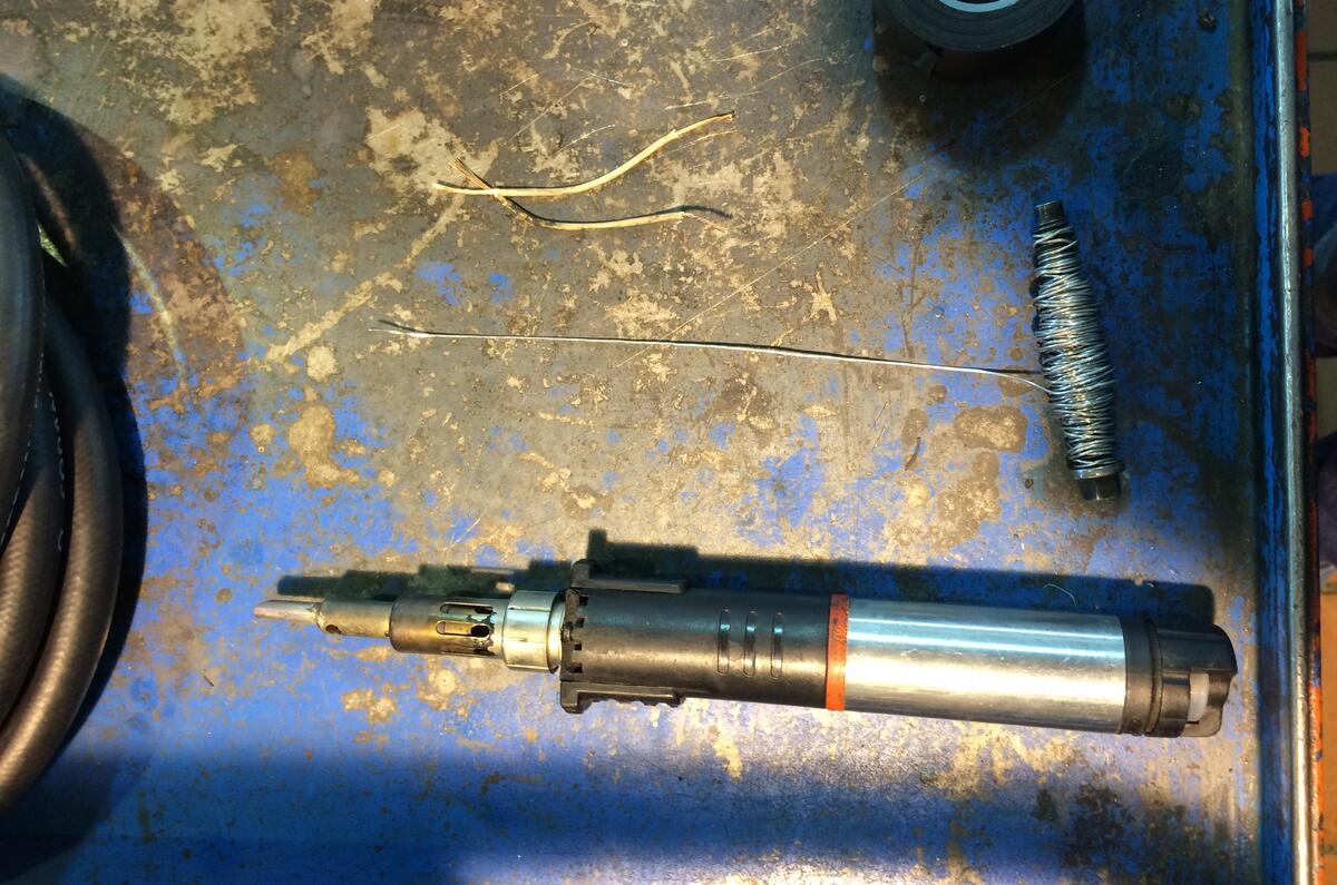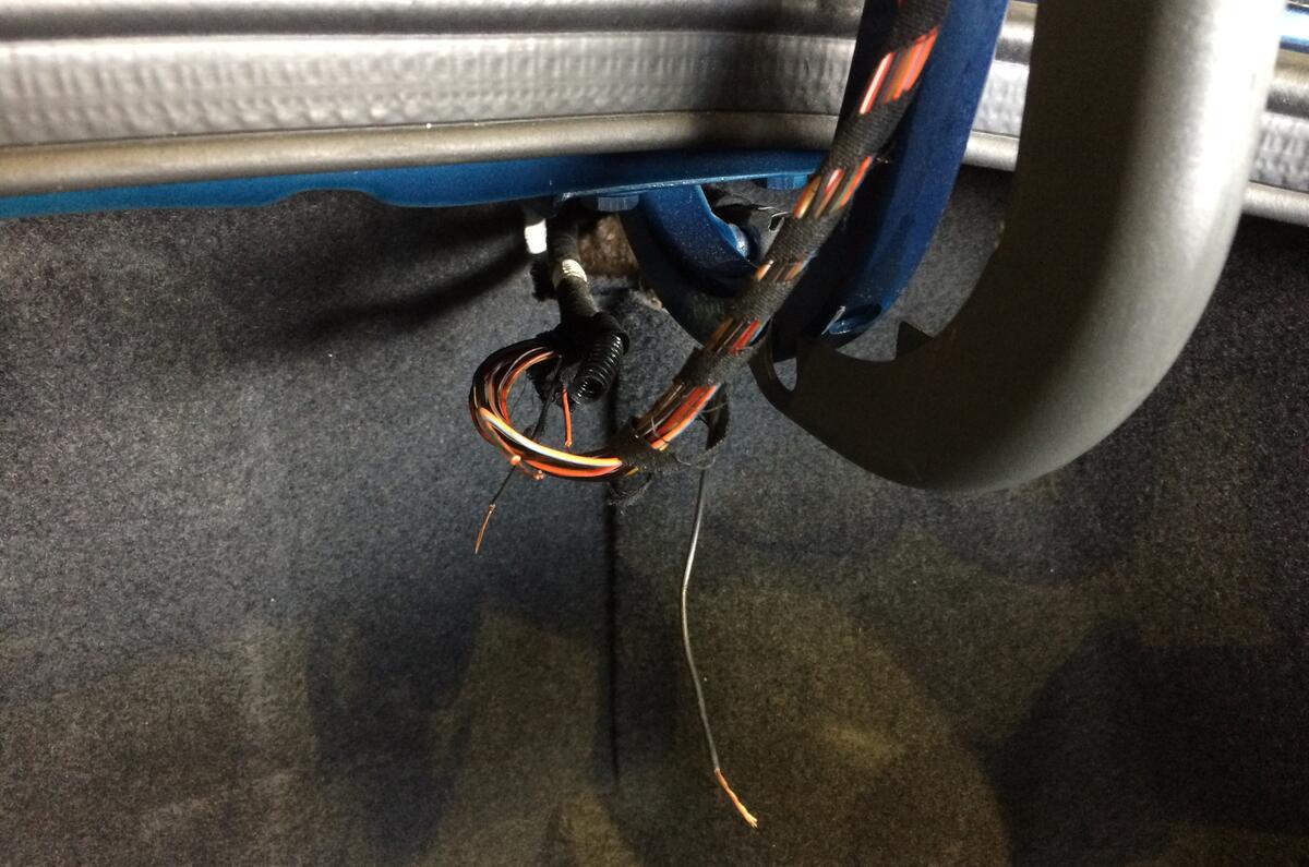 Embarrassing single-tone horn active and MOT certificate printed, we set about attending to some of the Jag's remaining problems. The first of them was an inoperative electronic boot release. This is a common problem, often caused by the wires chaffing on the boot hinge. Sure enough, pulling away the hinge cover revealed two broken wires.